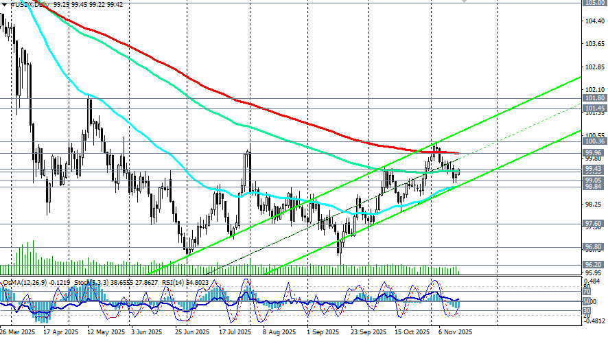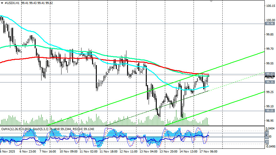 Оттолкнувшись в минувшую пятницу от 10-дневного минимума 98.96, фьючерсы на индекс доллара USDX пытаются возобновить восходящую динамику. В то же время цене необходимо преодолеть зону сопротивления вокруг уровней 99.35 (144-периодная скользящая средняя на дневном графике) и 99.43 (200-периодная скользящая средняя на 1-часовом графике).
