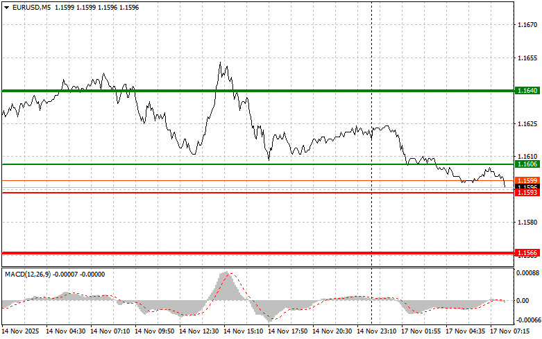 Сценарий №2: покупать евро сегодня также собираюсь в случае двух подряд тестов цены 1.1593 в момент, когда индикатор MACD будет находиться в области перепроданности. Это ограничит нисходящий потенциал пары и приведет к обратному развороту рынка вверх. Можно ожидать рост к противоположным уровням 1.1606 и 1.1640.