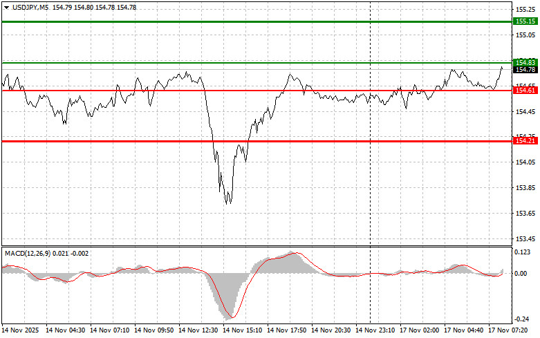 Сценарий №2: покупать USD/JPY сегодня также планирую в случае двух подряд тестов цены 154.61 в момент, когда индикатор MACD будет находиться в области перепроданности. Это ограничит нисходящий потенциал пары и приведет к обратному развороту рынка вверх. Можно ожидать рост к противоположным уровням 154.83 и 155.15.